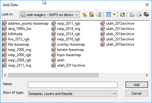 For USU students and employees, the State of Utah has acquired access to high resolution imagery. They are only accessible when on campus or using a VPN. The data is served by Utah’s AGRC. Below are the links set up for USU. A variety of layers are available: